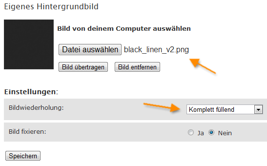 Das Einzige was ihr also tun müsst, um eurem Webseiten Background einen neuen Anstrich zu verpassen, ist die von Subtle Patterns heruntergeladene Datei unter Style > Eigener Hintergrund hochzuladen und die sonstigen Auswahlmöglichkeiten wie ihr auf dem folgenden Screenshot seht einzustellen.